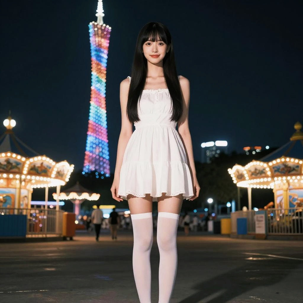 Realistic, photorealistic, masterpiece, incredibly absurdres, extremely detailed, best quality, 1girl, long black hair, blunt bangs, light smile, slim, full body, standing, looking at viewer, sweet_dress, white thighhighs, amusement park, night, night sky, dramatic lighting