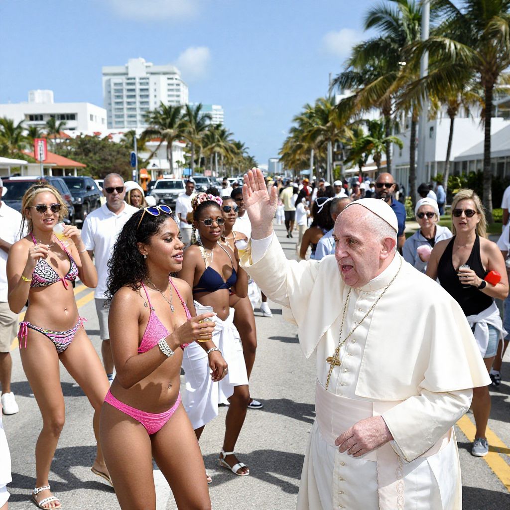 "Descender catholic pope francis wearing race suit in Monaco in pit lance getting ready to race a formula 1 car. Whole body. Wide angle,"