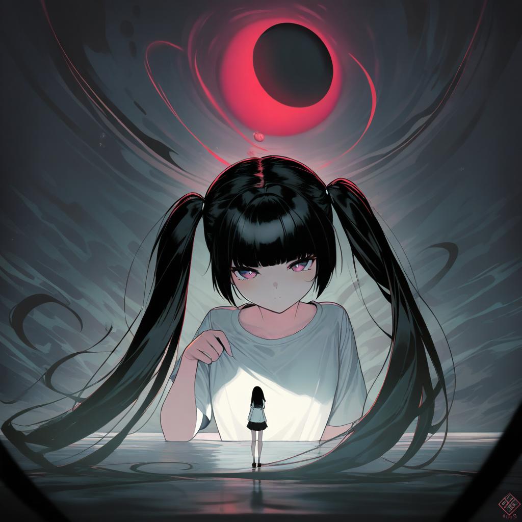 Monoko, yume nikki, 1girl, black hair, long hair, twintails, by artist suerte, animagine