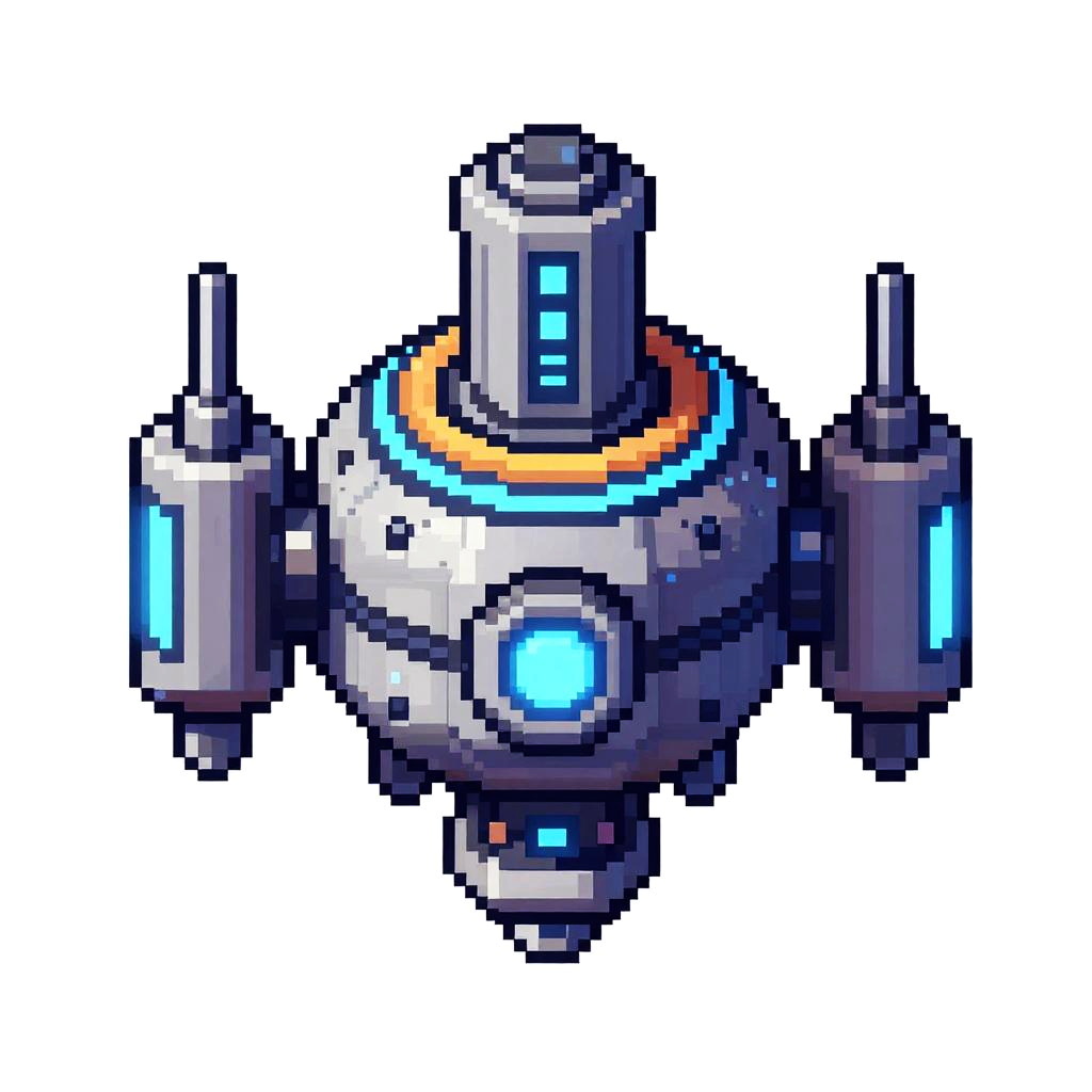 2d turret sprite design, top-down view, futuristic sci-fi style, detailed mechanical parts, glowing blue accents, pixel art, vibrant colors, game asset concept