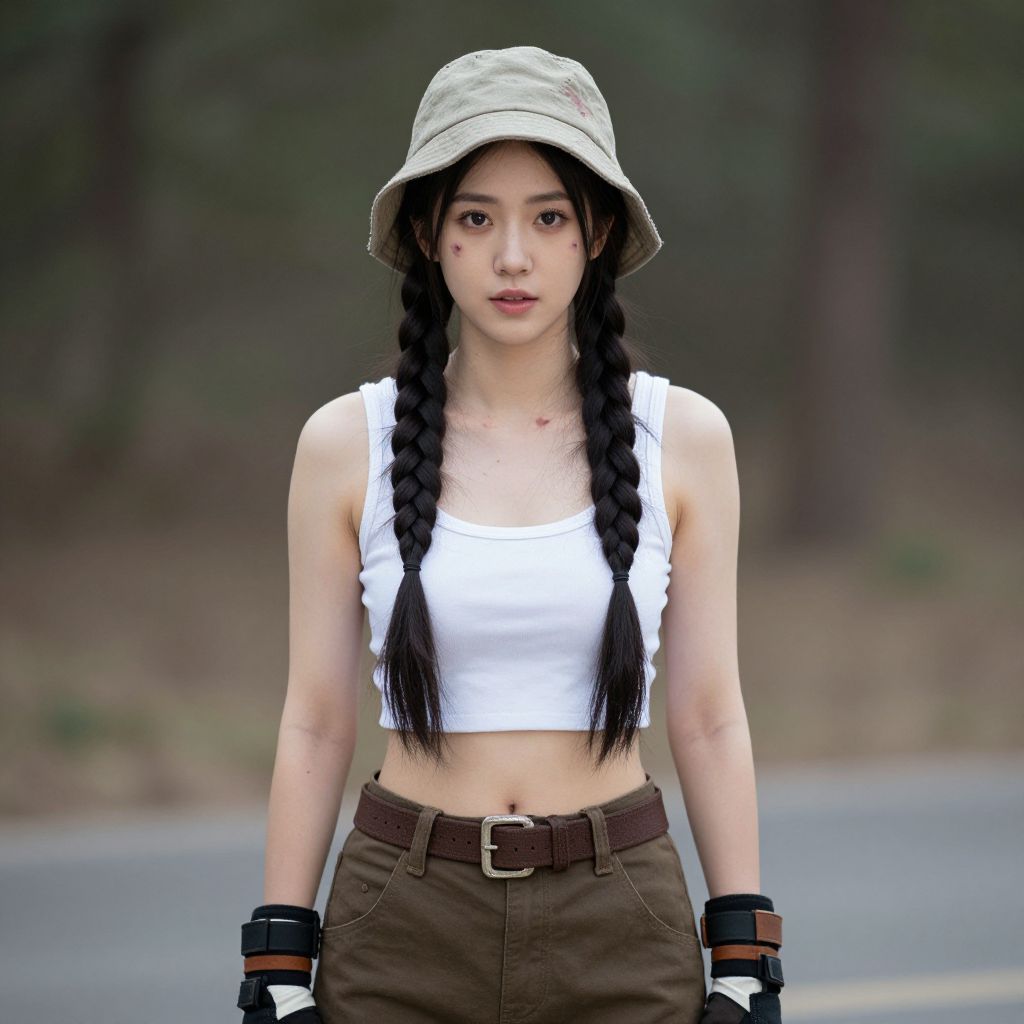 Photograph of a young Asian woman with fair skin, black braided hair, and a neutral expression. She wears a beige bucket hat, a white cropped tank top, brown cargo pants with a belt, and black fingerless gloves. Her midriff is exposed, and she stands in a blurred forested area with a road in the background. The image has a slightly desaturated, realistic style with a soft focus on the background, emphasizing the subject in the foreground.