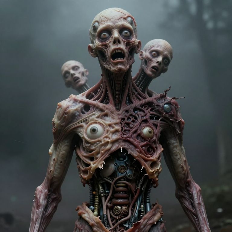 Body horror concept art showing a contorted figure with multiple faces and eyes growing out of the torso, textured flesh peeling away revealing strange biomechanical innards, moody atmospheric fog, horror surrealism with high detail and depth