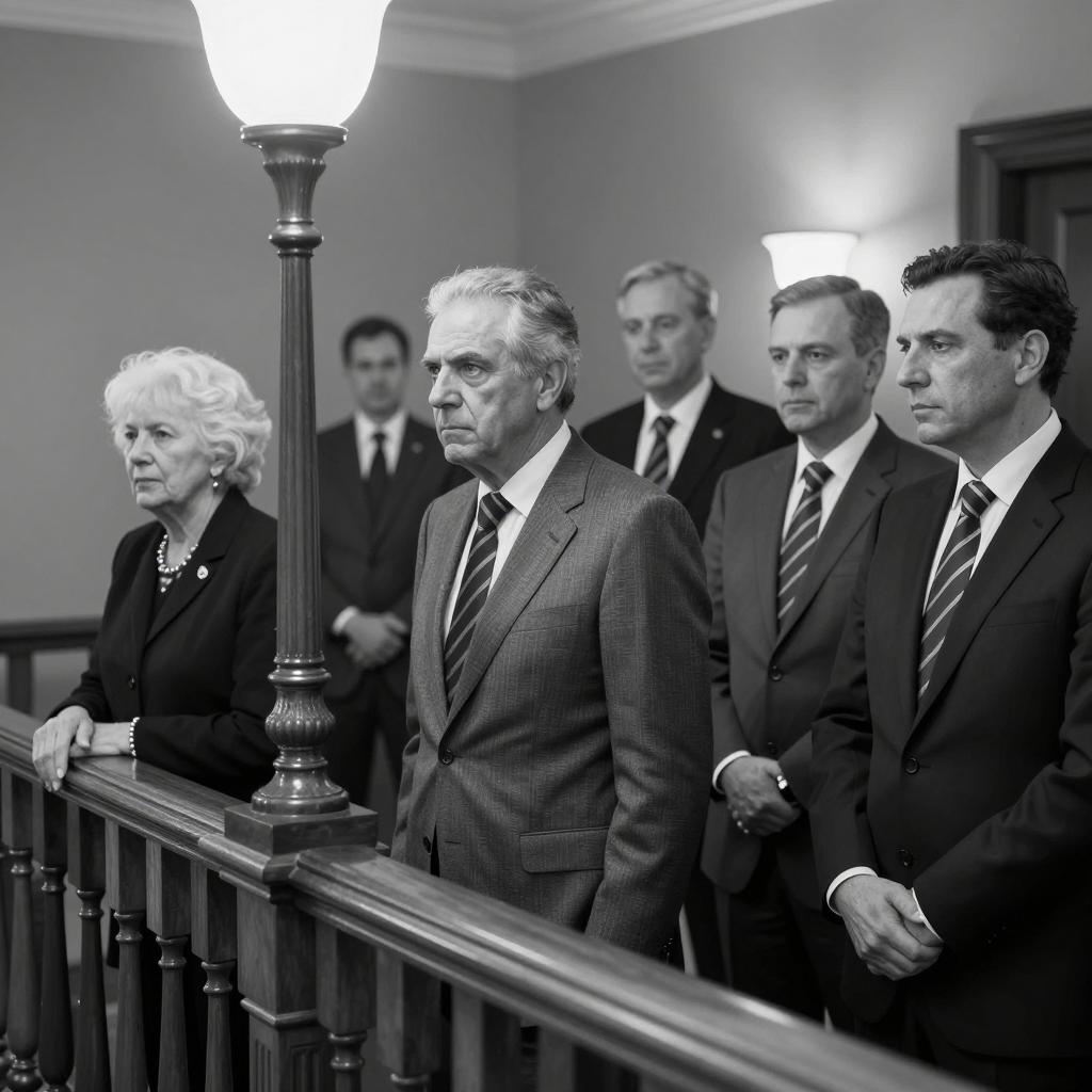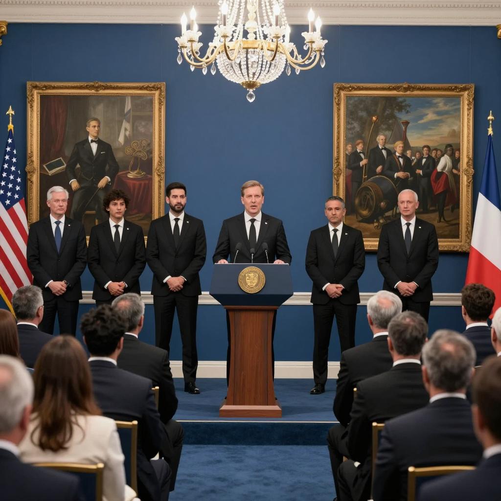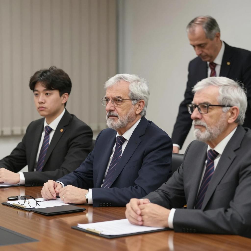 A formal indoor business or government meeting scene featuring three standing men in dark suits, one older bald man gesturing with his hands at the center, flanked by two men on either side. A woman in a hat and dress stands to the left near a large window with grid panes. Twelve men in business suits and ties are seated on either side facing inward, arranged in a symmetrical manner. The setting includes a large wooden desk and a neutral shaded carpet floor, suggesting a professional diplomatic or executive environment.