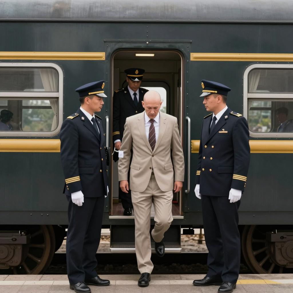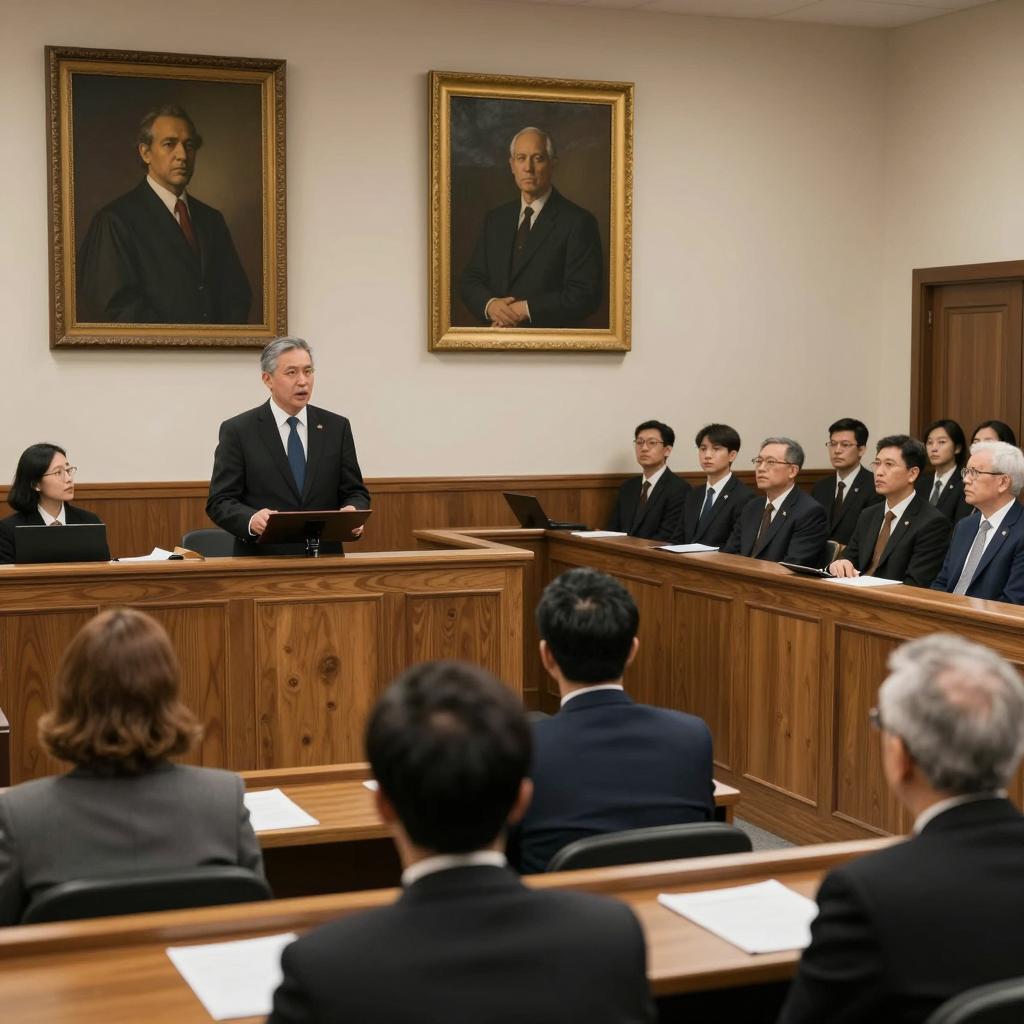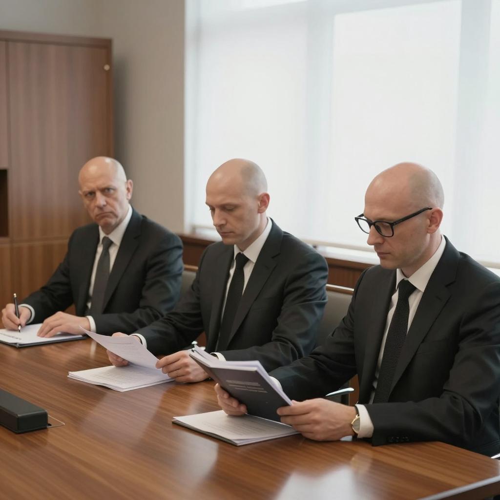 A formal indoor business or government meeting scene featuring three standing men in dark suits, one older bald man gesturing with his hands at the center, flanked by two men on either side. A woman in a hat and dress stands to the left near a large window with grid panes. Twelve men in business suits and ties are seated on either side facing inward, arranged in a symmetrical manner. The setting includes a large wooden desk and a neutral shaded carpet floor, suggesting a professional diplomatic or executive environment.