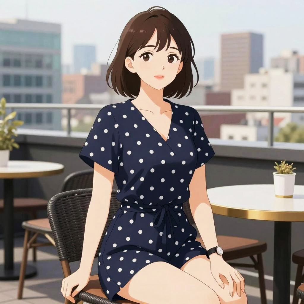 A Pear-shaped body type woman in a casual chic navy blue romper with white polka dots, short sleeves, and a cinched waist, minimal accessory with a black wristwatch, seated at a city rooftop cafe, illustrated in the style of Kodansha comics. Sexy. Pretty face and beutiful eyes