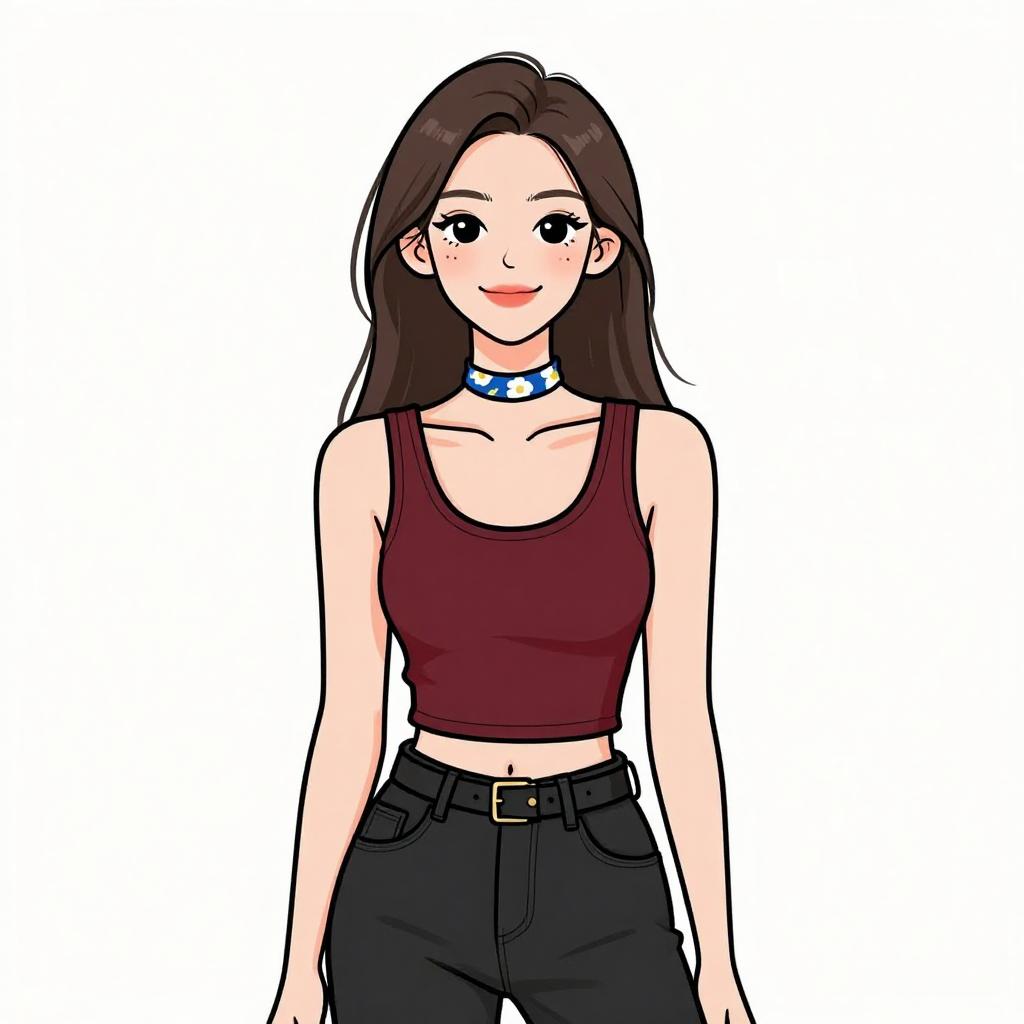 This is a digital drawing of a young woman with long, straight black hair and fair skin. She has large, expressive black eyes and a slight smile. She is wearing a black strapless crop top that reveals her midriff and high-waisted black pants. Around her neck is a black choker with a small silver square pendant. The background is plain white, making the character stand out prominently. The art style is clean and minimalist, with bold black outlines and flat colors. The woman's pose is relaxed, with her arms hanging naturally by her sides.