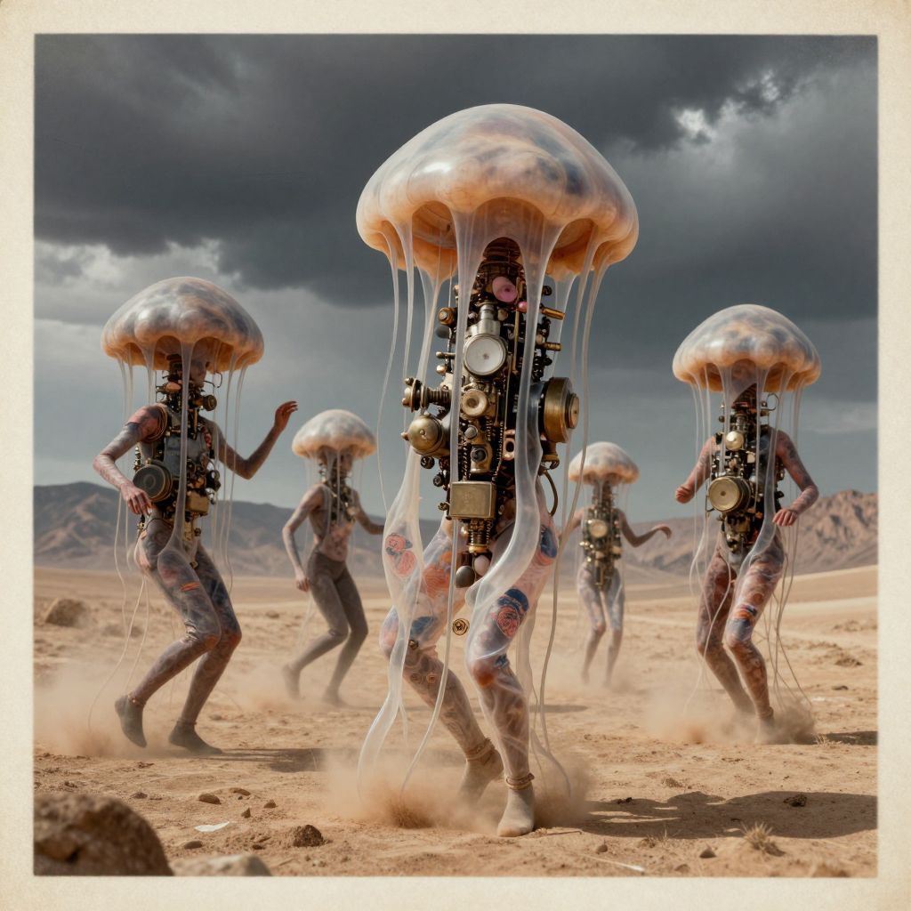 Photorealistic digital artwork: Six humanoid figures with jellyfish-like transparent domes and mechanical bodies running in a desert under dark, stormy sky.