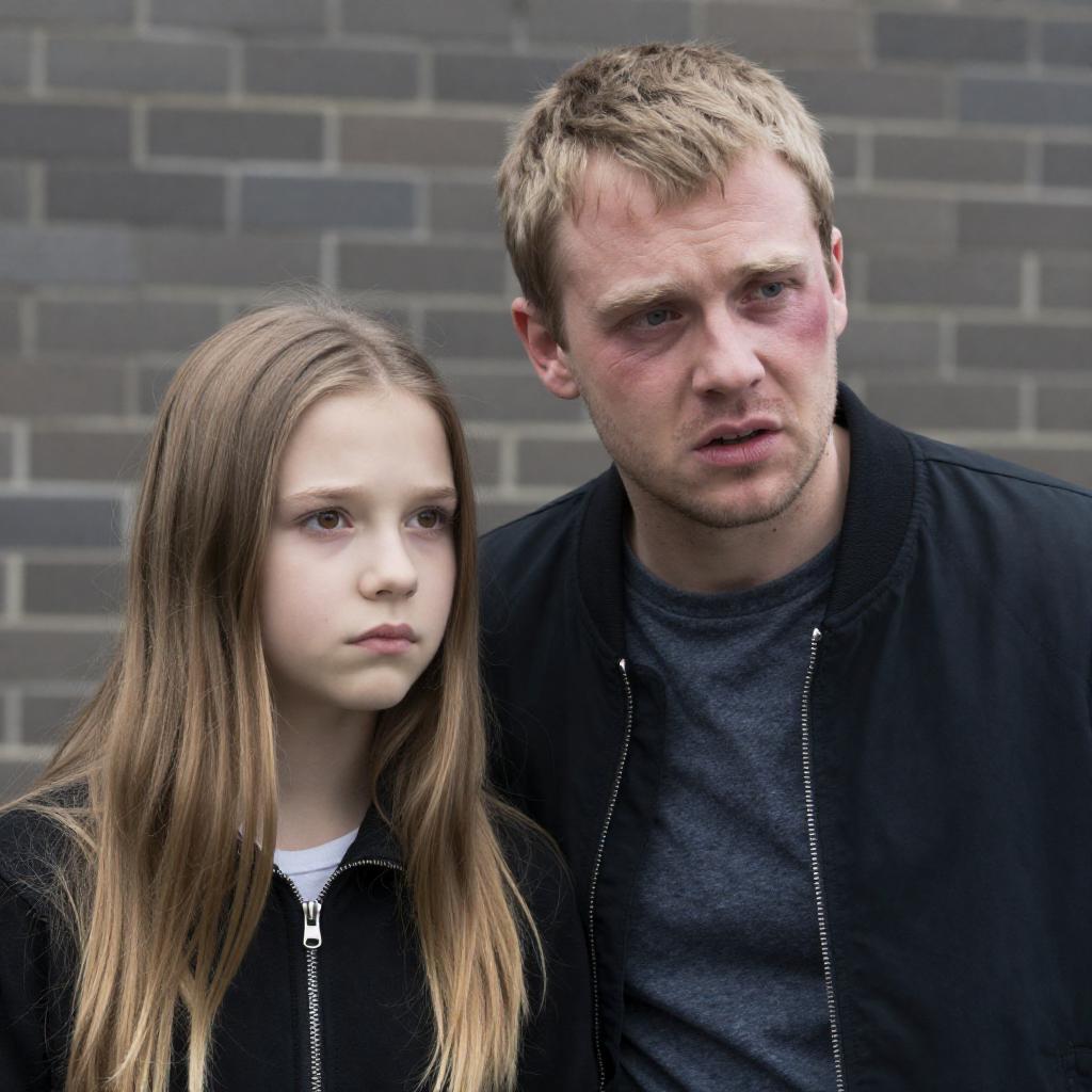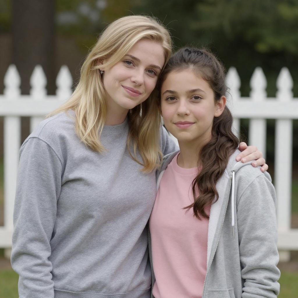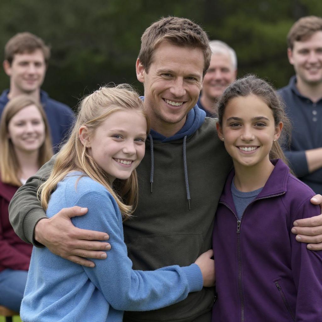 Photograph of a man with short brown hair, smiling, wearing a dark green shirt and blue hoodie, hugged by a blonde girl in a blue sweater. A brown-haired girl in a purple jacket stands to his right, smiling. Several people in the background, some seated, some standing, smiling. Greenery in the background.