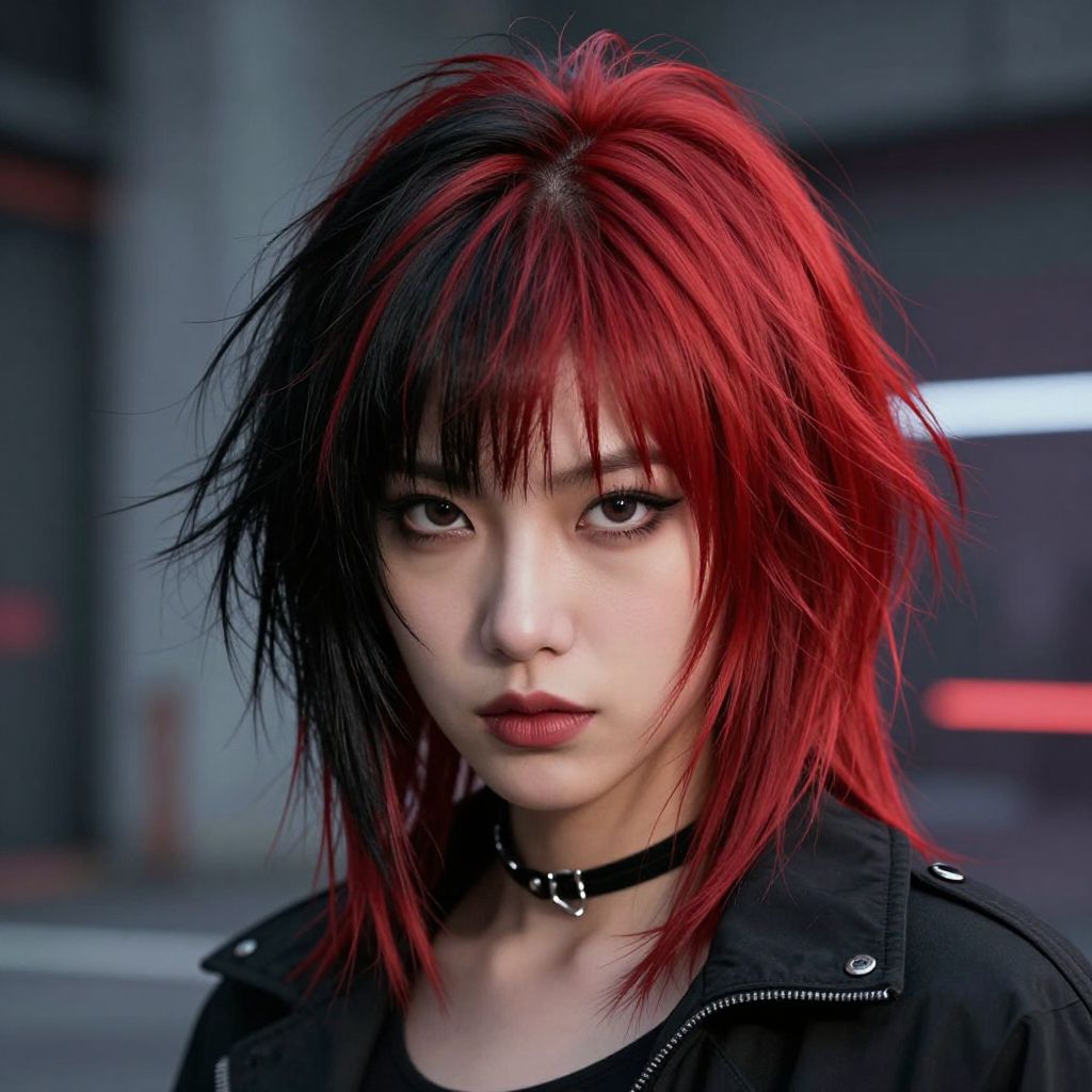 Photorealistic digital portrait of an Asian woman with vivid red-black hair, intense gaze, black choker, and black jacket, set against a blurred