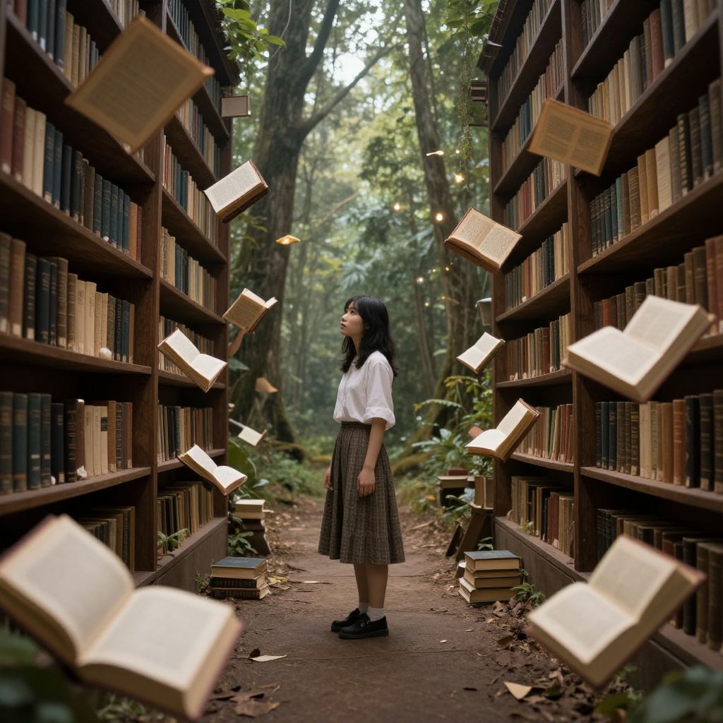 A young woman stands amidst a mystical forest pathway, surrounded by towering bookshelves brimming with ancient volumes, as enchanted books float gracefully around her, their pages shimmering with ethereal light.