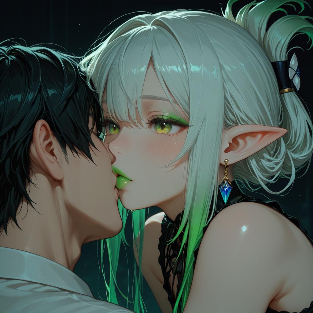 Hanabatake chaika, nijisanji, 1boy, green lips, pointy ears, yellow eyes, green eyeshadow, black hair, green hair, long hair, gradient hair, folded ponytail, virtual youtuber, virtual youtuber, earrings, elf, lipstick, by artist ferret-san, dark_illustrious