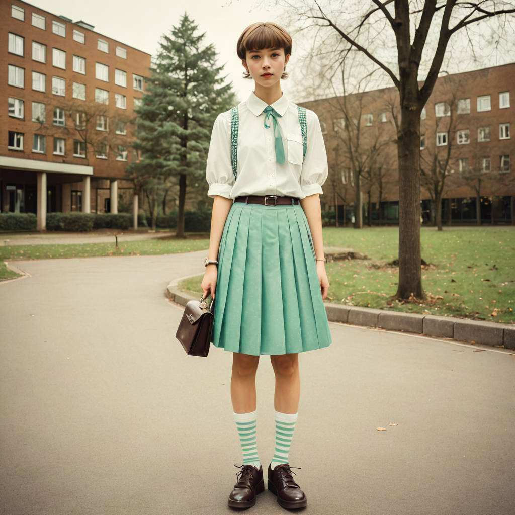 Photo of a Tall woman, Messy Bun hair, school girl outfit, pleated skirt in Azure, white blouse made of Modal, knee-high socks, loafers with polka dot, street market, etherial ambiance