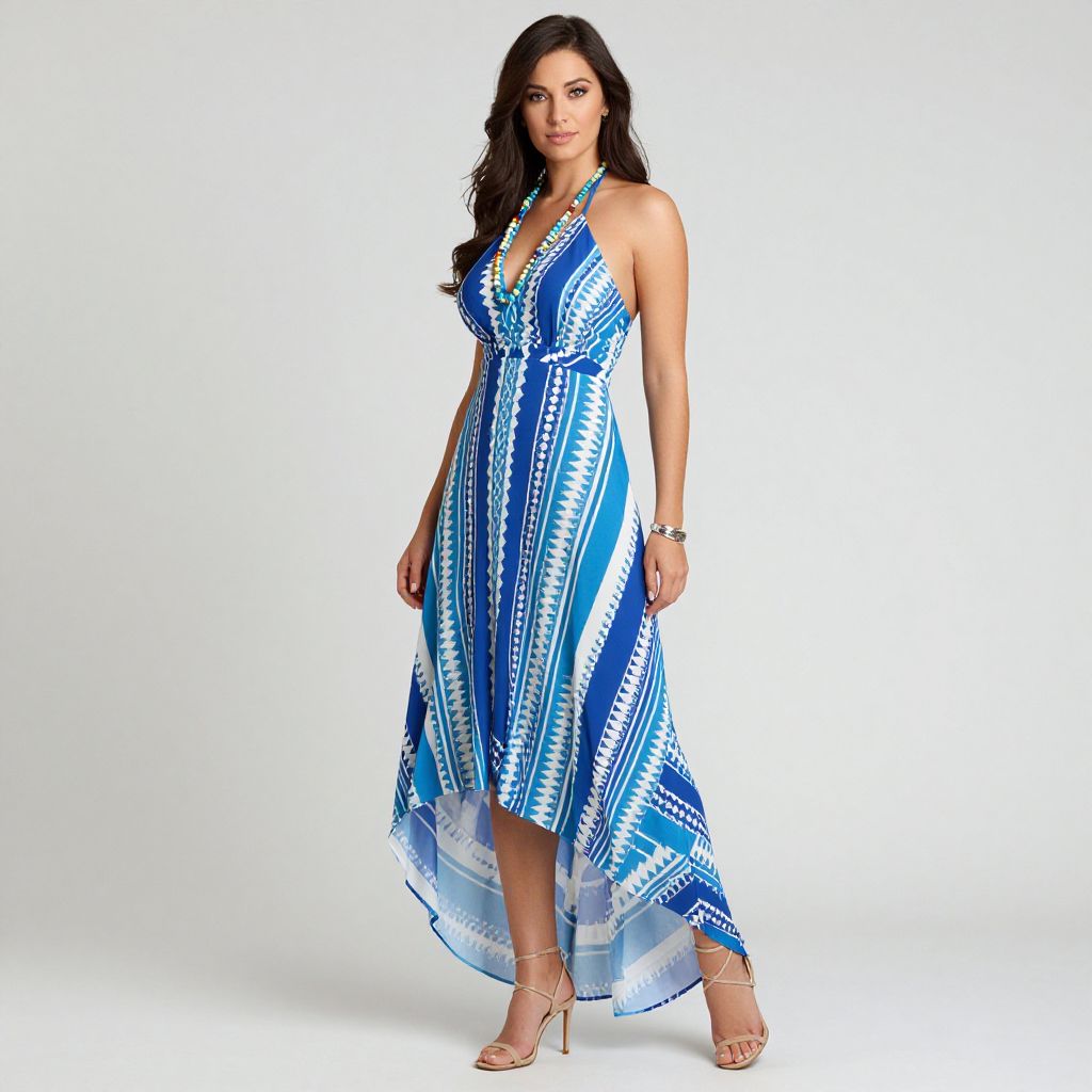 Woman, summer clothing, sleeveless halter-neck dress in bold blue and white geometric pattern, asymmetrical high-low hemline, flowing silhouette, beige strappy high-heel sandals, beaded necklace in coordinating colors, silver bangle on the wrist.. Sexy. Pretty face and beаutiful eyes. Big breasts.
