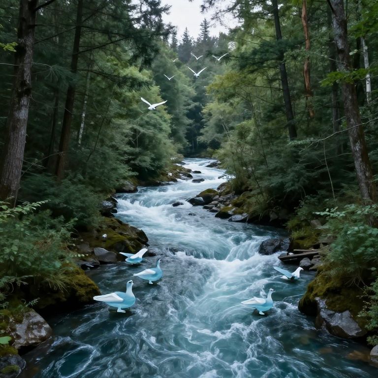 Achingly slow-moving rivers of molten glass carry islands shaped like frozen birds, gliding无声ly through an upside-down forest.