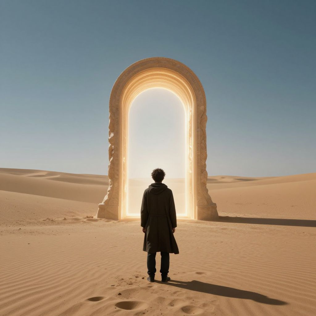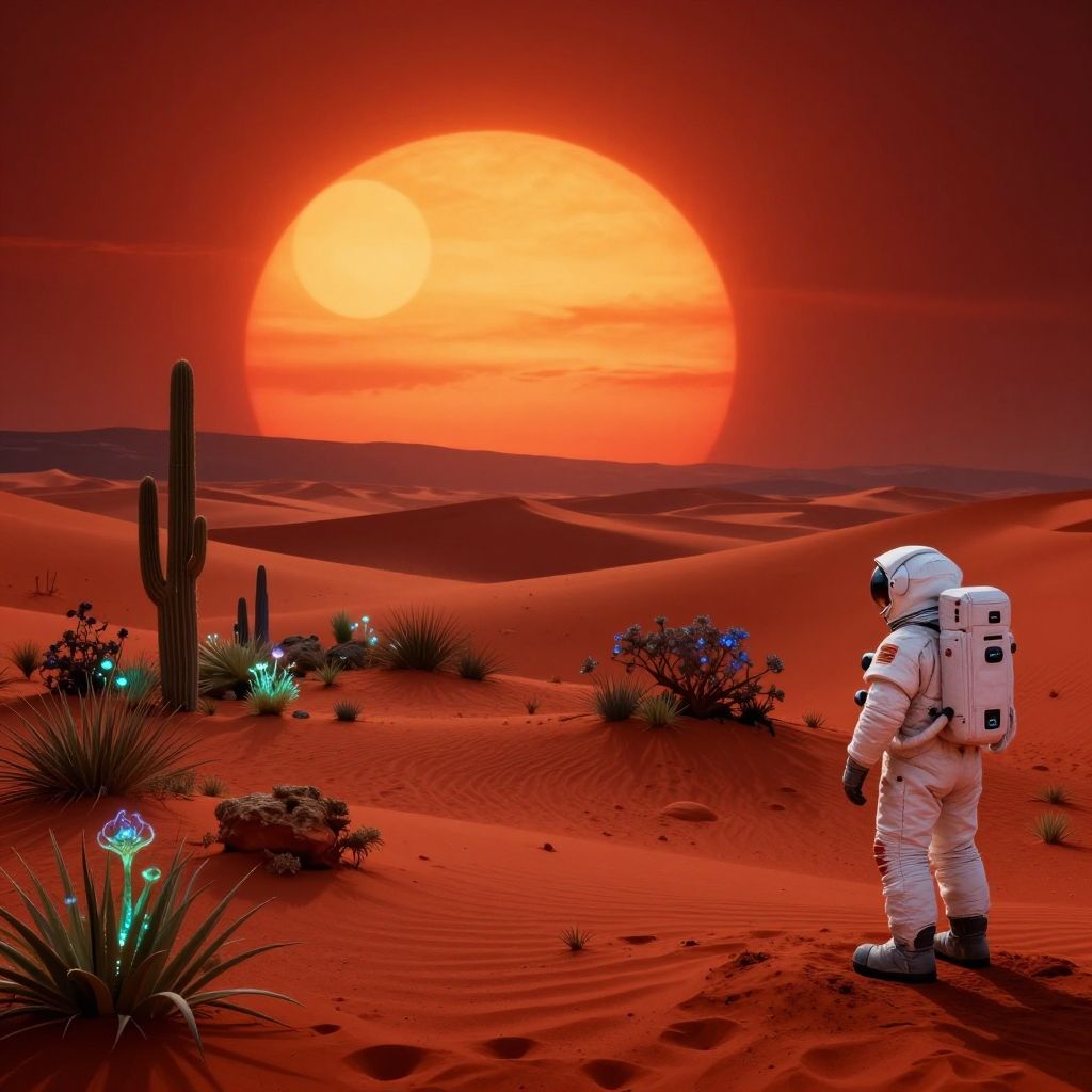 Silhouetted figures walking across orange desert sand with footprints, towards a bright, sunlit planet and starry sky. Digital artwork.