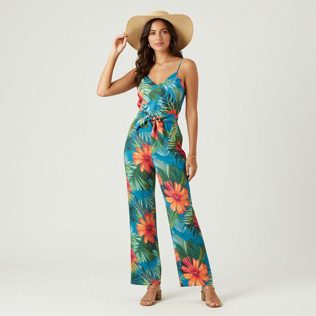 Photograph of a smiling woman with long, wavy, dark brown hair, wearing a wide-brimmed straw hat, a vibrant blue, floral-patterned romper with pink and orange hibiscus flowers, and green palm leaves. She has a light brown skin tone and is standing against a plain white background. Her romper has thin spaghetti straps and a small bow at the waist. She wears beige, open-toed sandals and a simple gold bracelet on her right wrist. The image has a bright, summery feel, showcasing a casual, stylish beach or resort outfit.