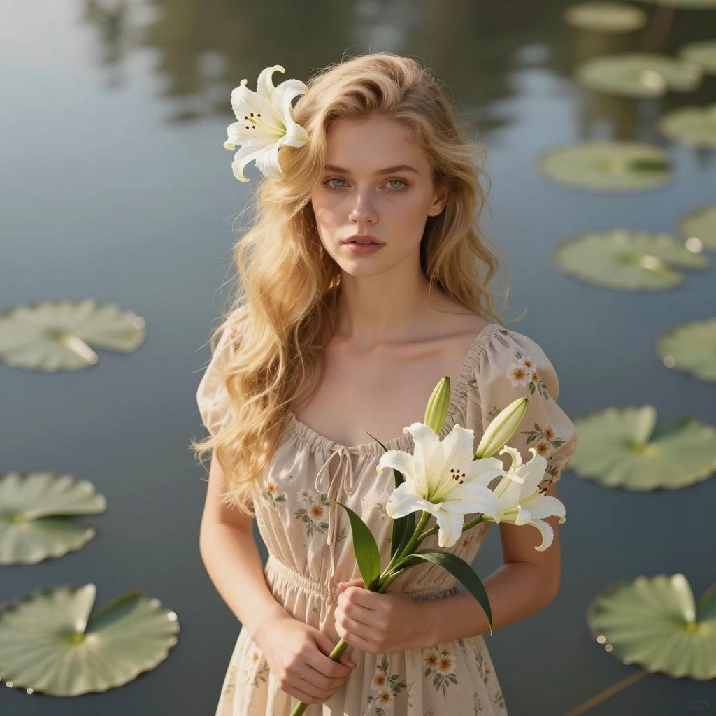 Blonde woman with long, wavy hair, green eyes, and fair skin stands in water with lily pads. Wearing a beige, floral dress, she has white lilies in her hair and hands. Golden sunlight highlights her face and dress. She looks directly at the camera with a neutral expression. Digital illustration with a realistic style.