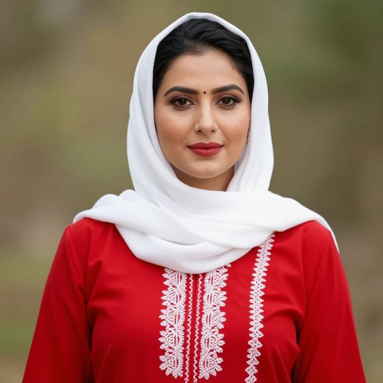Female wearing a red dress with white embroidery and a white scarf on her head.