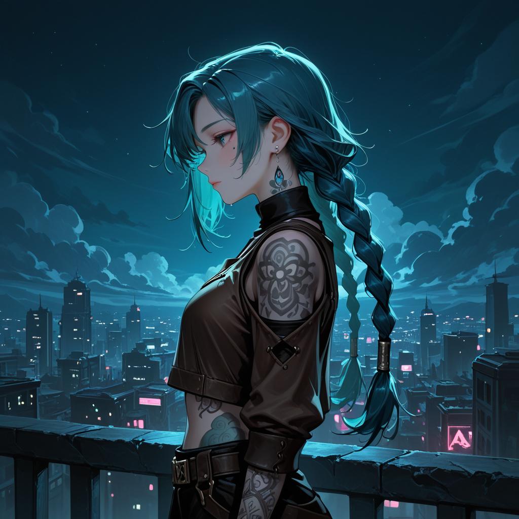 Digital illustration of a young woman with blue hair styled in a long braid, featuring arm tattoos and asymmetrical bangs. She wears a brown crop top shirt and stands against a nighttime city skyline illuminated by neon lights and clouds. The image captures her side profile with pink eyes and red lips, embodying an arcane or cyberpunk aesthetic.