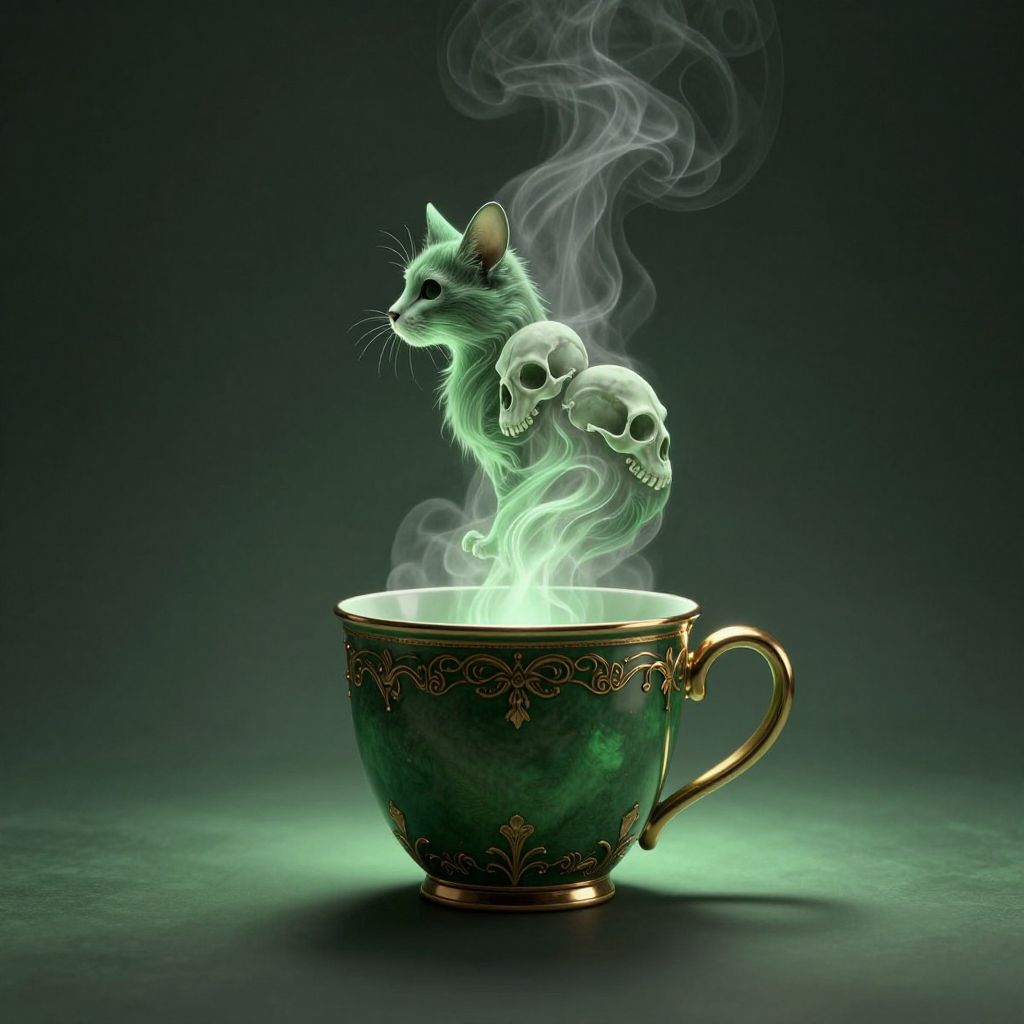 A digital illustration depicts a green, ornately decorated teacup with a golden handle. Emerging from the glowing green steam is a ghostly, ethereal cat with glowing green fur, and two floating skulls with skeletal features. The cat's eyes are bright green, and wisps of smoke curl upwards around it. The background is a dark gradient from black to green, enhancing the eerie, supernatural atmosphere. The teacup's intricate patterns and the cat's mystical appearance create a surreal and otherworldly scene.