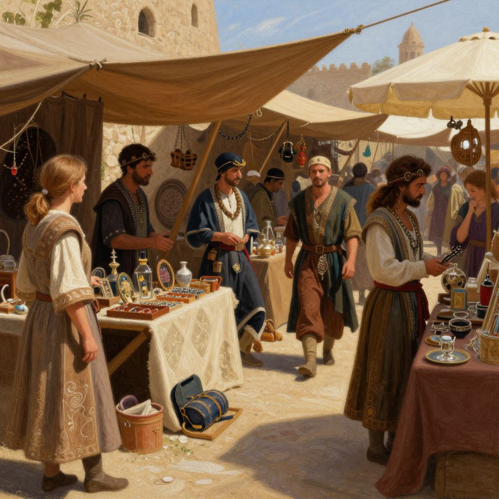 Medieval marketplace scene: Men in dark tunics, headscarves, and belts, discussing glassware and pottery under beige tents, with a young