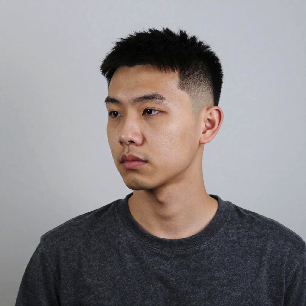 Portrait of a man with level 1 fade haircut, confident expression, casual clothing, minimalist studio background, soft shadows emphasizing the fade transition, high detail, contemporary haircut style.