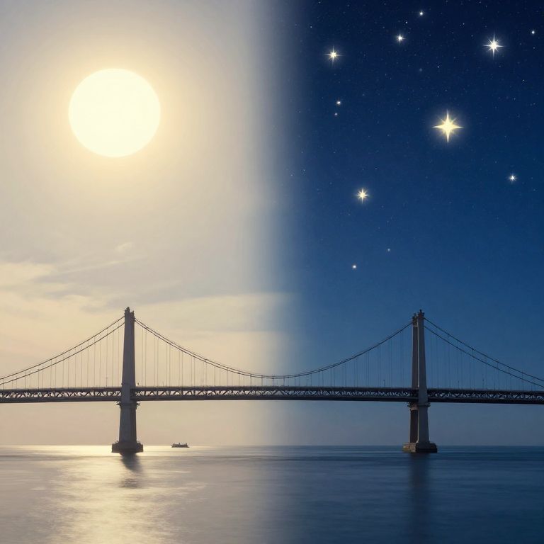 Photograph of a suspension bridge at night, split diagonally between a bright, sunlit sky on the left and a deep, starry sky on the right. The bridge, with two tall towers and intricate cables, stretches horizontally across the calm, reflective water. The sun's glow blends into the stars, creating a gradient from yellow to blue. Stars are scattered above the bridge, adding a celestial feel. The overall composition combines day and night elements, contrasting light and darkness.