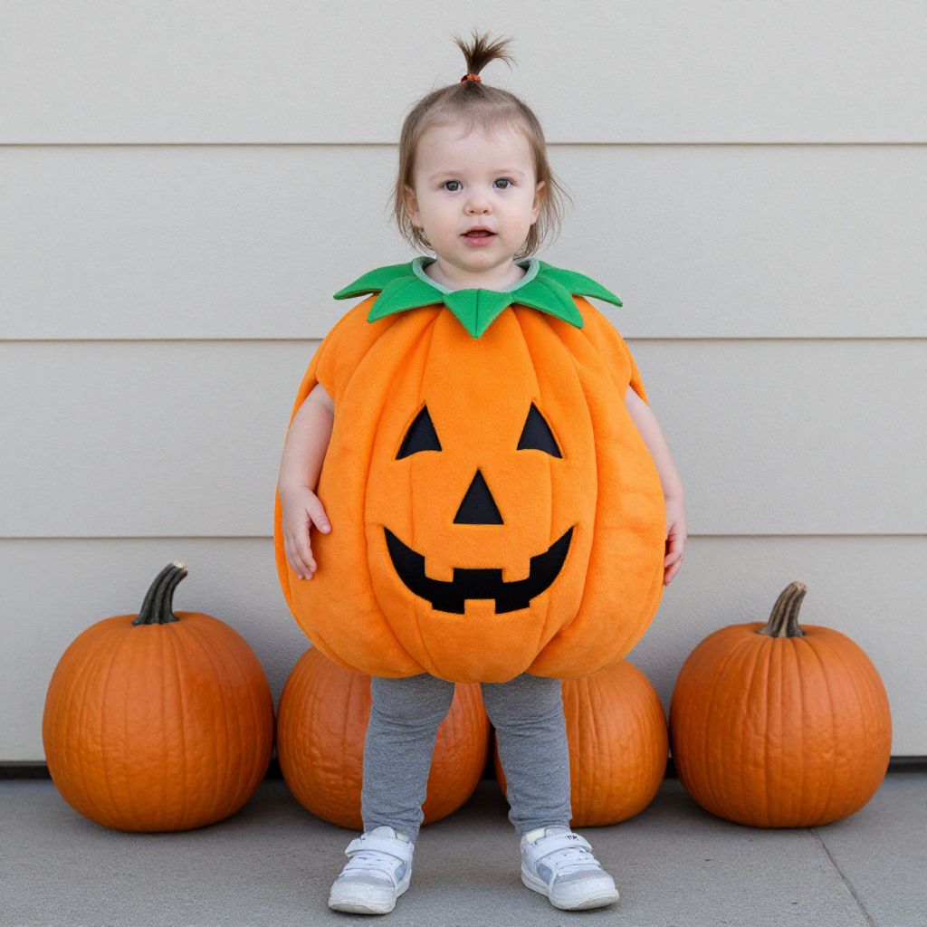 Toddler Pumpkin Costume, child in a pumpkin costume standing in front of a pumpkin