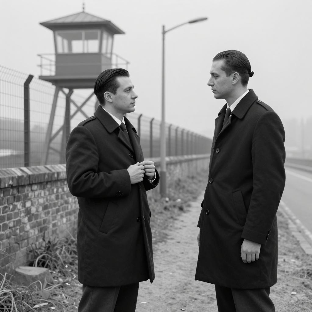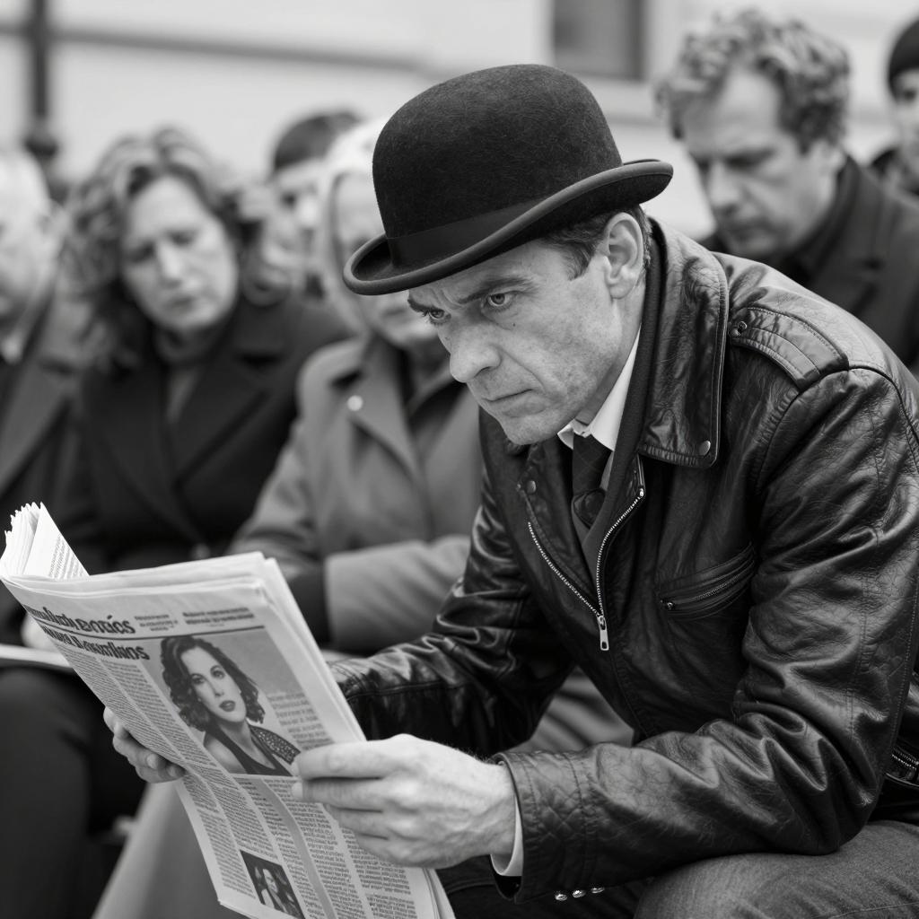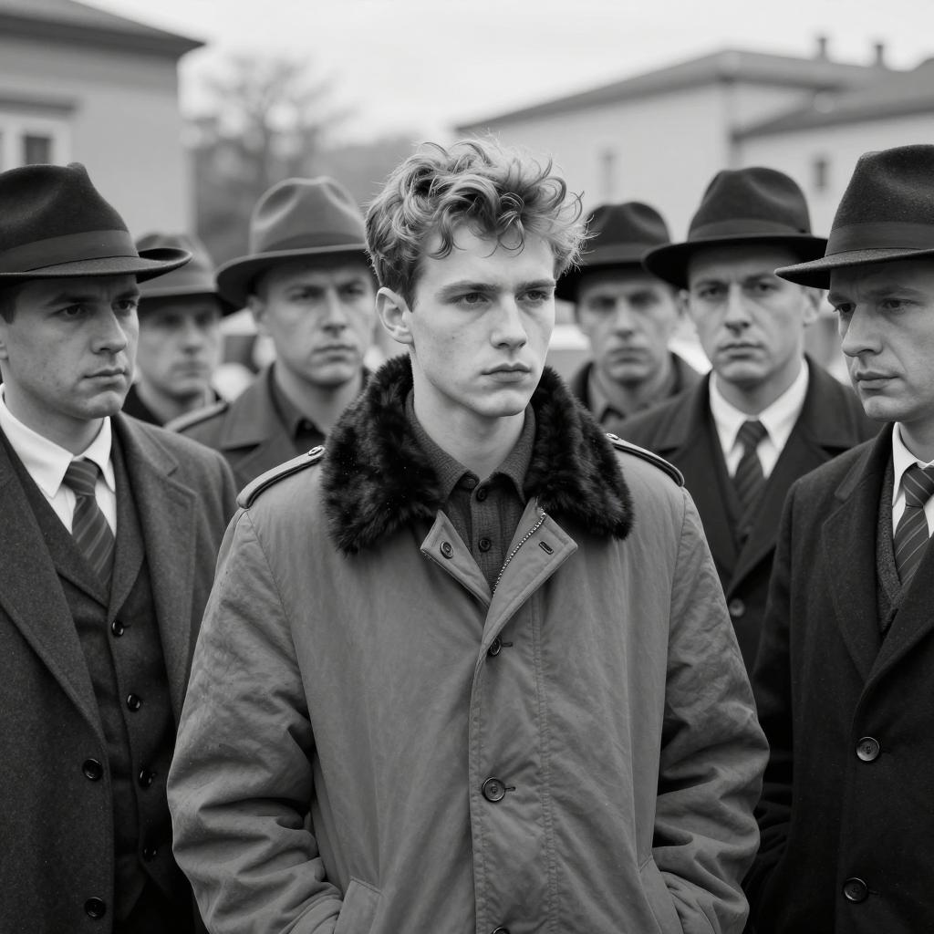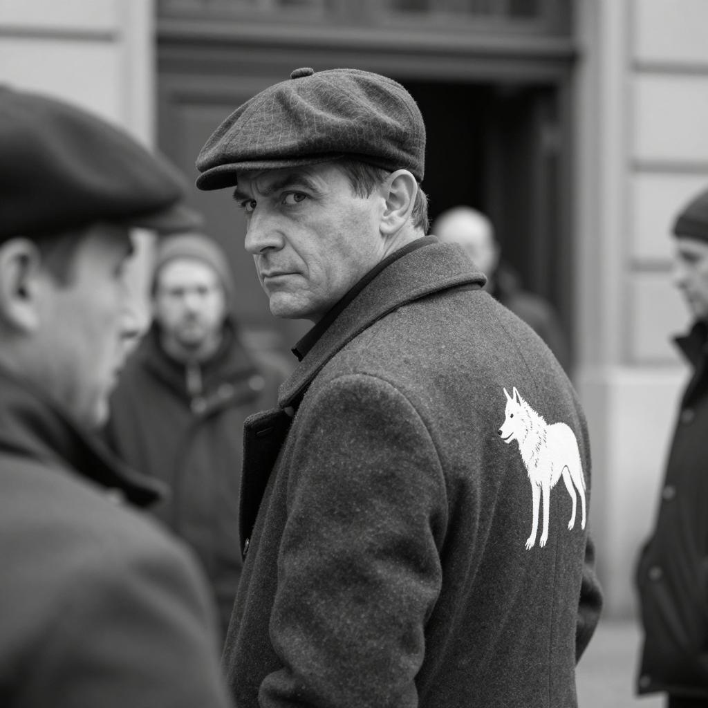 Black and white photograph of a group of men in a crowded outdoor setting with an iron bridge in the background. Central man with a stern expression, wearing a dark beret and coat, stands in front. Crowded platform above filled with men in hats and coats. Smaller group of men in foreground, one wearing a cap. Smoke in the background. Several men with hats and overcoats, some looking down. Multiple hands visible, some holding objects.