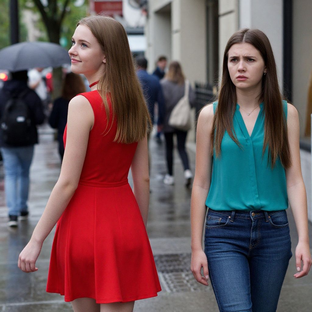RAW photo, 8k uhd, dslr, soft lighting, high quality, film grain, Fujifilm XT3, hyper realistic, photograph the woman on the viewer's left is looking over her left shoulder while walking away, (she wears a sleeveless red dress and a narrow red choker:1.3), angelic supermodel, she is unaware of the other two people, she is unaware of the viewer, (she is looking in the distance to her right:1.3), she looks very happy, she is caucasian with long straight hair. the woman on the viewer's right is looking directly at the woman in the middle, she looks disgusted, she is wearing a sleeveless teal blouse and blue jeans, she is caucasian with long straight hair. the (blurred:1.3) background is a city where they are walking on the sidewalk, wet, rain, romantic, Hyperdetailed Photography