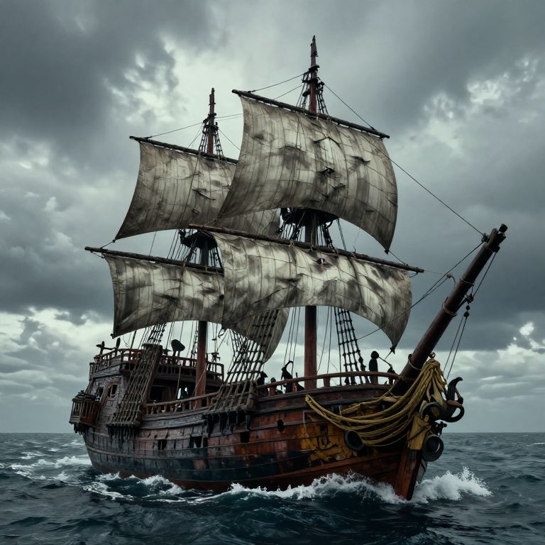 Photorealistic digital painting of a weathered, three-masted wooden pirate ship sailing through choppy, dark blue ocean waters under a cloudy, stormy sky. The ship's sails are tattered and gray, with ropes and rigging visible. The ship's hull is dark brown with signs of wear and age. The bow, adorned with golden ropes, points forward, cutting through waves. Silhouettes of sailors are visible on the decks, adding a sense of scale and movement. The overall mood is dramatic and foreboding, with intense lighting highlighting the ship against the stormy backdrop.