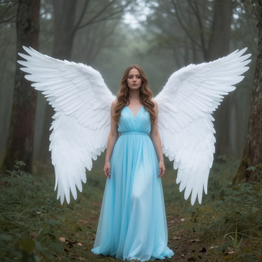 Photograph of a surreal forest scene. A woman with fair skin and dark brown hair, dressed in a white, sleeveless, knee-length gown, floats with outstretched arms and large, gray wings above a tree-shaped greenery. She is centered in the image, above a dirt path flanked by tall, dense evergreen trees. A lone man in a black jacket and jeans walks away from the camera on the path, while a black bird flies to the left. The sky is overcast, adding a moody atmosphere to the forest setting.