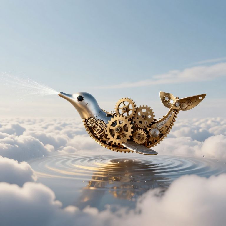 A clockwork whale swims through the sky, its gears whirring softly as it spouts oil instead of water, casting golden ripples onto the clouds.