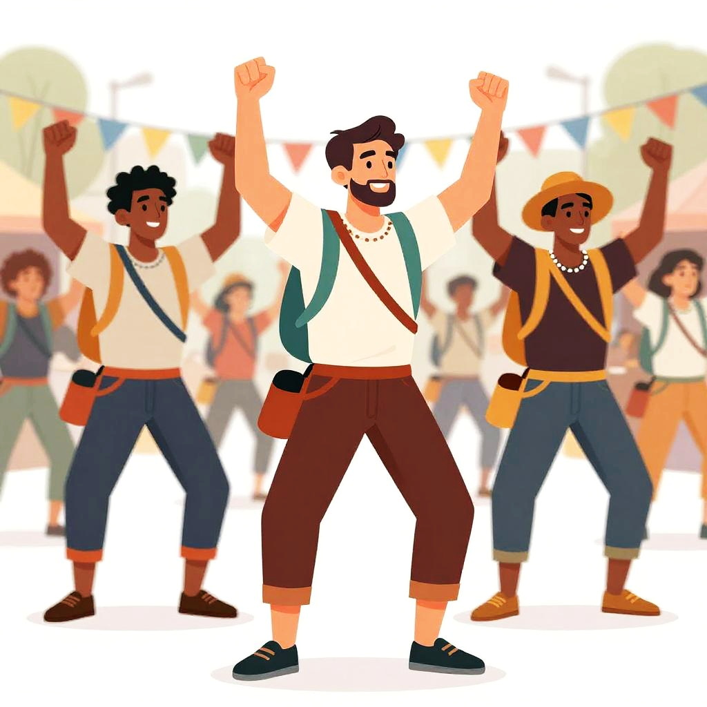 Group of wide hips men dancing at a lively festival, colorful costumes, motion blur effects, festive atmosphere, joyful expressions, high detail illustration