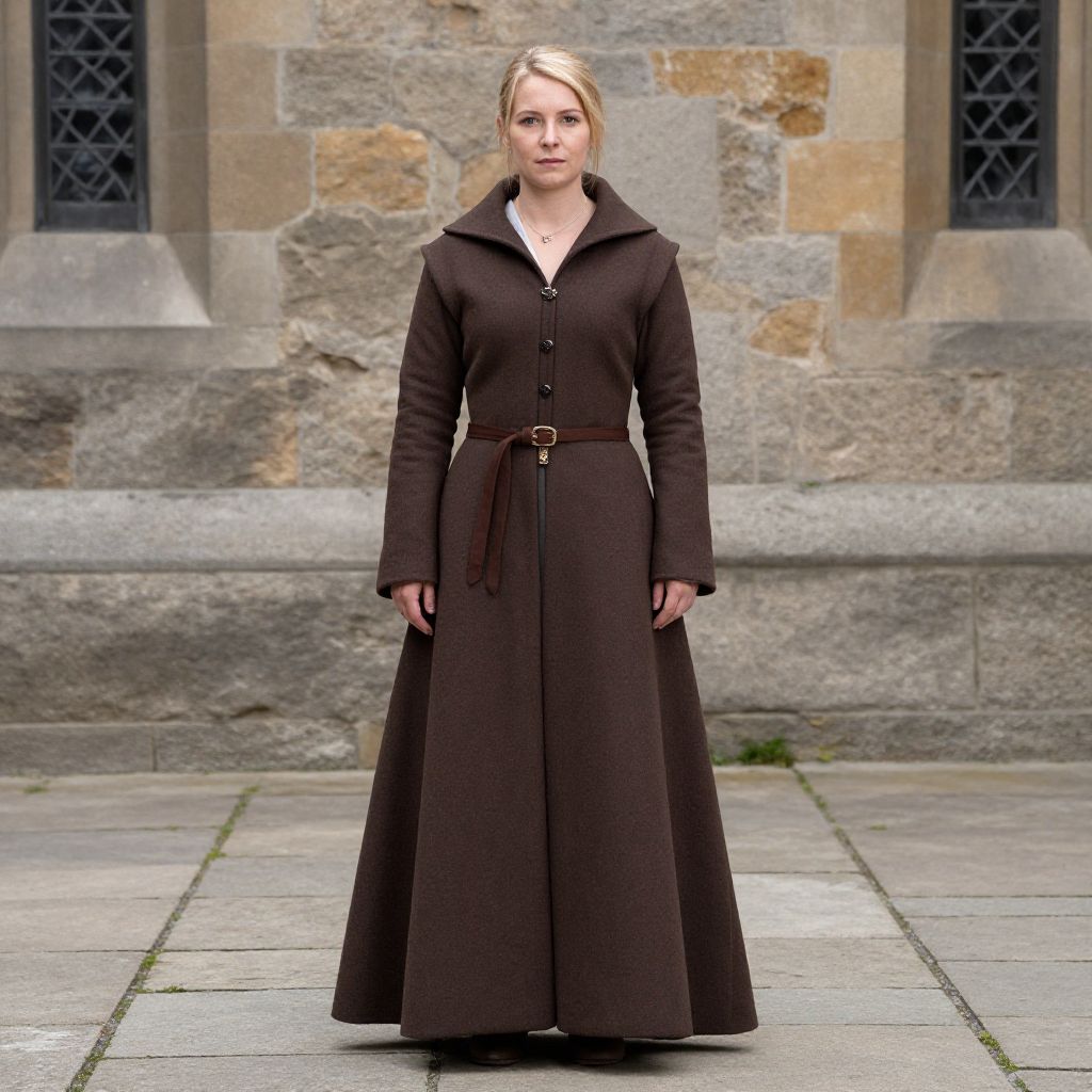Quality Medieval Costume, woman in brown coat standing in front of a stone building