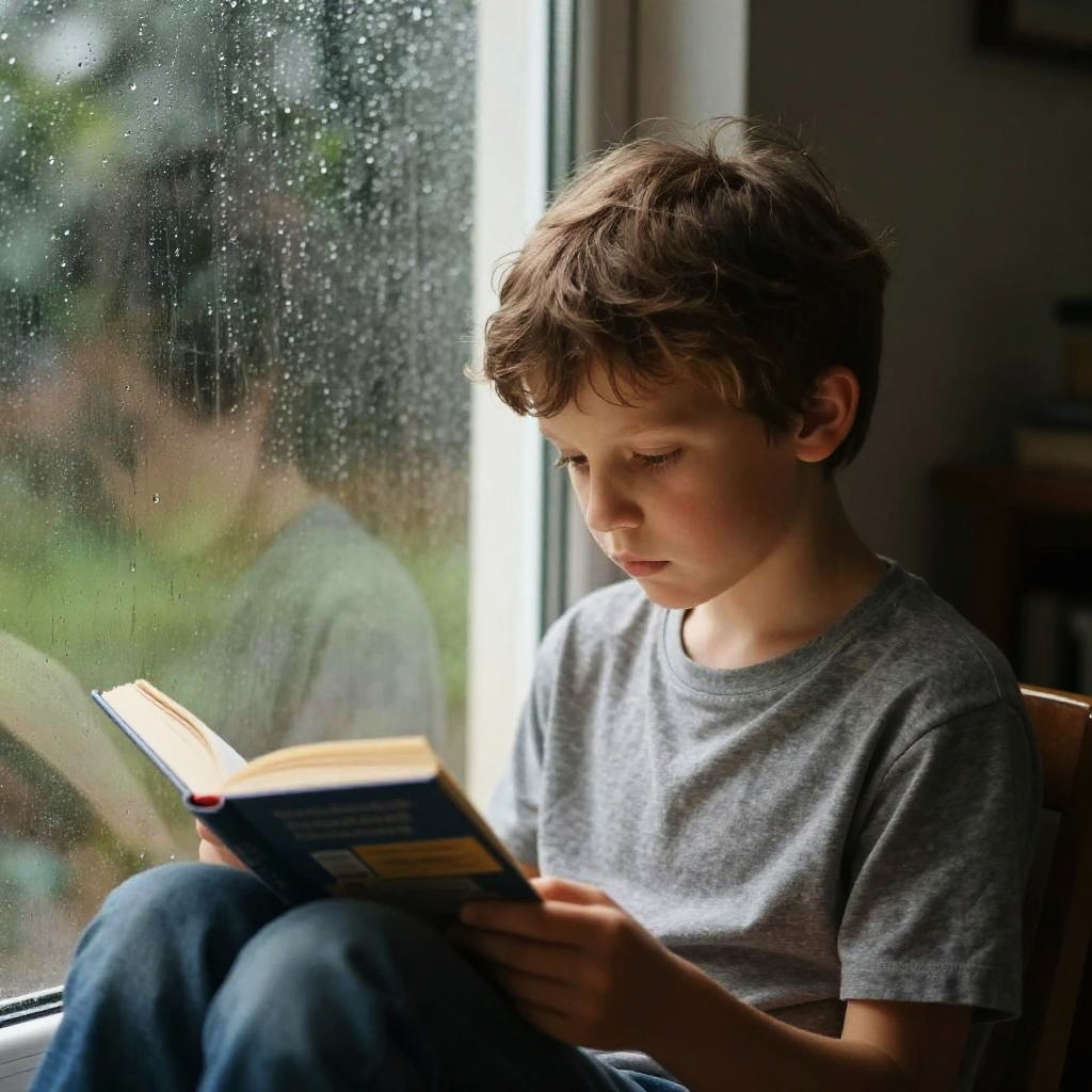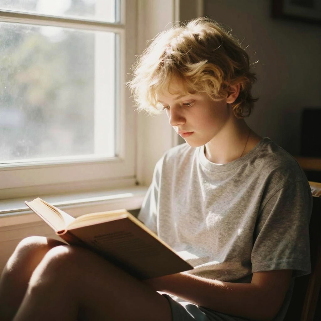 Blonde hair teenager sitting by a window in a cozy room, reading a book, warm sunlight streaming in, soft focus, natural textures, peaceful and introspective mood