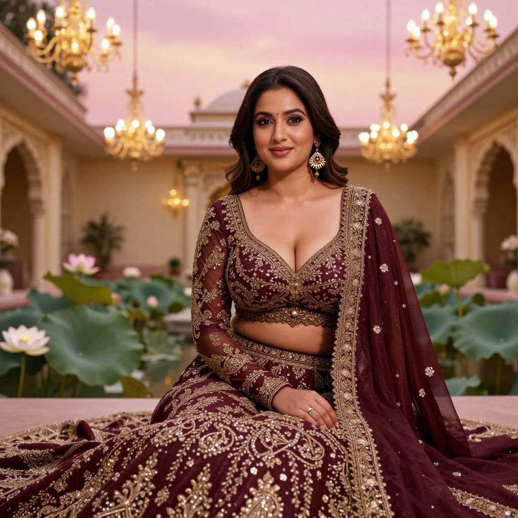 A graceful Indian woman with a soft, warm smile and medium brown skin, wearing a highly detailed maroon lehenga that features shimmering golden lace work, seated in a traditional courtyard garden with blooming lotuses and chandeliers, under a pink and gold sky. The woman has big breasts and cute face