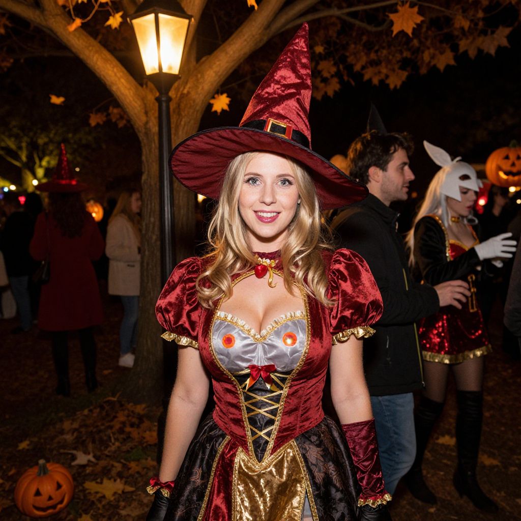 A vibrant outdoor costume party at a city park on Halloween night, featuring a diverse group of people in elaborate costumes, including a woman in a red and gold witch outfit with a pointed hat and big, glowing eyes, standing near a lantern-lit tree with autumn leaves falling in the background.. The woman has big tits and cute face