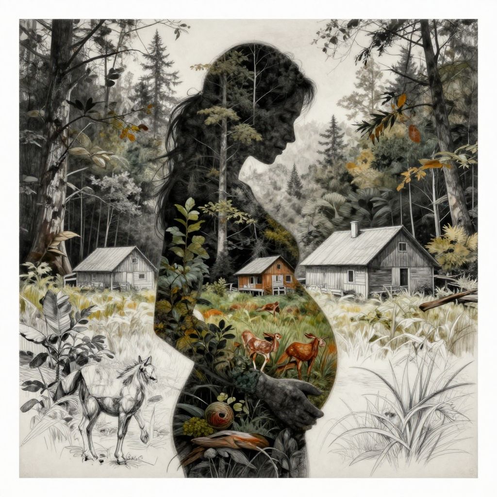 Pregnant contented Female silhouette, interwoven with rural and natural elements, photorealistic and sketch combination, homestead merging with temperate rainforest, stark contrast in textures, monochrome and color blend, thought-provoking juxtaposition, deep shadows, complex narrative, mixed media art