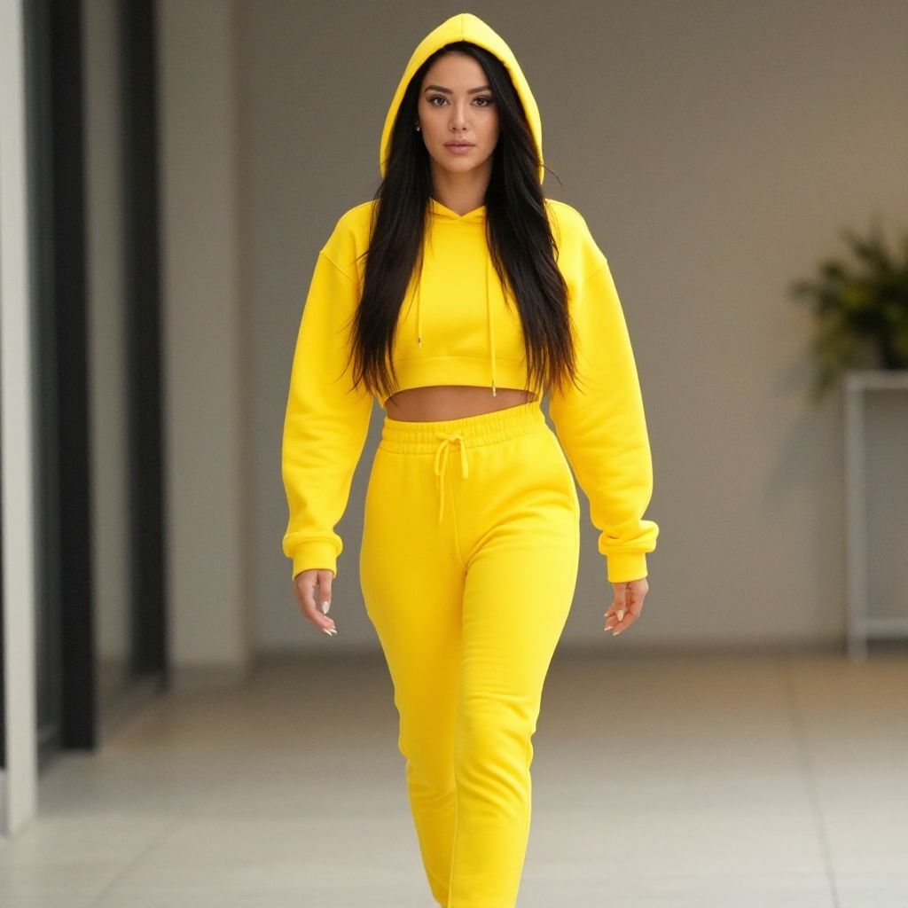 Photograph of a curvy woman with long black hair, wearing a bright yellow hooded crop top and matching jogger pants, walking confidently indoors.