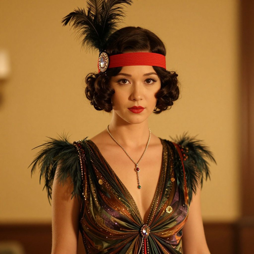 The image depicts a beautifully rendered flapper from the 1920s, exuding elegance and sophistication. The woman is adorned in a striking, vintage-style dress with a deep neckline and a feathered headpiece that adds a touch of glamour. Her hair is styled in a short, curly bob, typical of the era, and she wears a red headband with a decorative crystal. The dress features intricate details, including a feathered shoulder and a delicate necklace that complements her attire. The background is a warm, golden hue, creating a cozy and inviting atmosphere that contrasts with the woman's striking appearance. The overall composition is balanced, with the woman centrally positioned and the elements of her outfit arranged harmoniously, highlighting the artistry and attention to detail in the image.