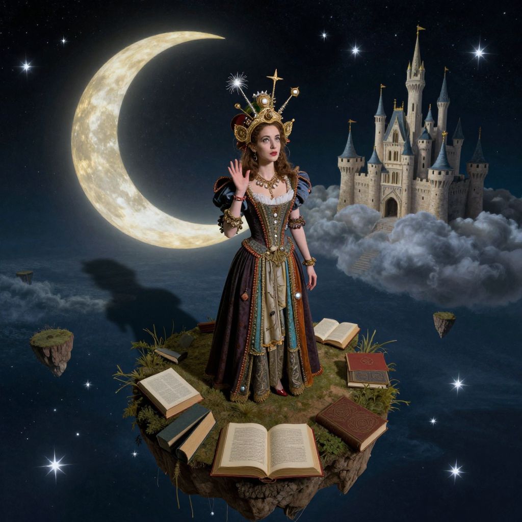 Craft an image that embodies the whimsical surrealism of Dali's landscapes, featuring a mystifying woman with cascading crimson hair standing on a levitating glass staircase winding upwards into a dreamy expanse filled with melting clocks and abstract lunar features. She dons a gown woven from shifting sand and crystal fragments, with beams of light radiating from her fingertips as she extends towards the distant horizon. The scene should instill a sense of marvel and inquiry, merging elements of fantasy and science fiction in an imaginative and visually striking composition that questions our perception of reality.
