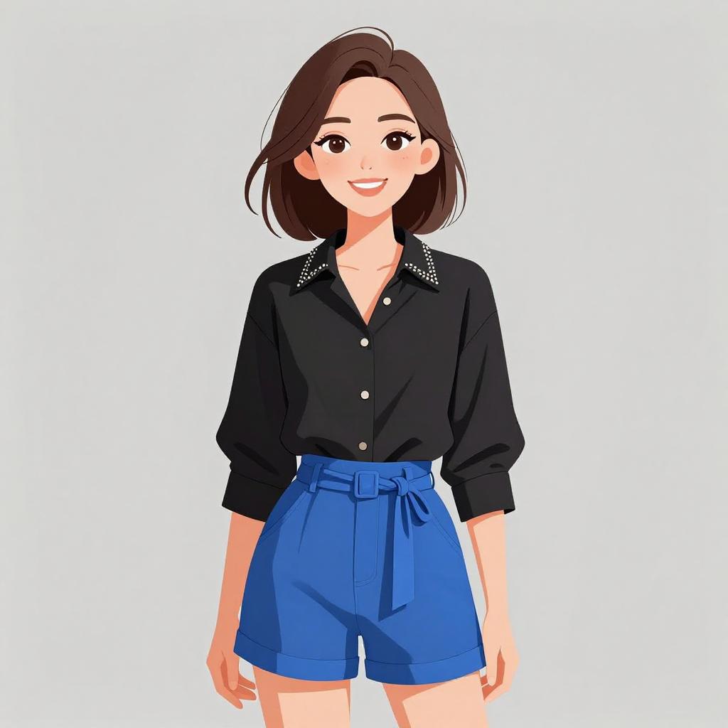 Digital anime-style illustration of a smiling woman with short brown hair, wearing a black button-up shirt and high-waisted blue shorts.