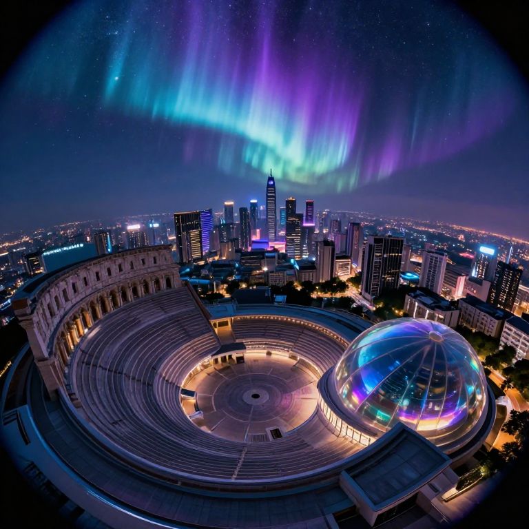 An alluring scene reminiscent of swirling landscapes captures an urban wonder emerging from the churning, dreamlike auroras of a distant galaxy. The architecture fuses ancient amphitheaters with sleek modernism, adorned in iridescent metals and translucent domes that shimmer under the starlight. From a high aerial viewpoint, the viewer gazes upon this urban marvel as if through a fish-eye lens, distorting perspectives into a mesmerizing blend of macro and microcosmic imagery. The color palette dances between vivid blues and purples, contrasting starkly against the luminescent cityscape while suggesting a profound sense of mystery and wonderment. This image reflects a harmonious balance of technical precision and artistic vision, inviting the viewer to immerse themselves in an otherworldly experience that transcends the boundaries of time and space.