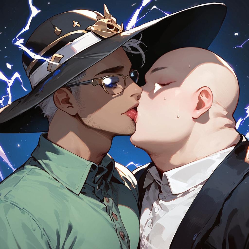 Score_9, score_8_up, source_anime, 1boy, incrslowtier, electricity, upper body, glowing eyes, no eyes, expressionless, black eyes, dark-skinned male, facial hair, glasses, black headwear, green shirt