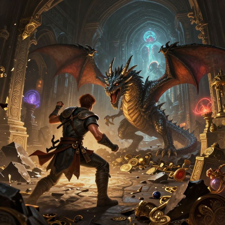 Dungeon fantasy art showing a heroic adventurer battling a fierce dragon amidst rubble and treasure piles inside a vast, dimly lit dungeon chamber, with intricate stone carvings, glowing magical artifacts, and a mysterious portal in the background, vibrant and dynamic art.