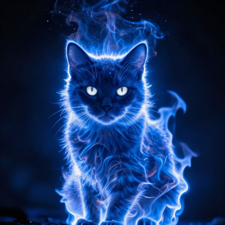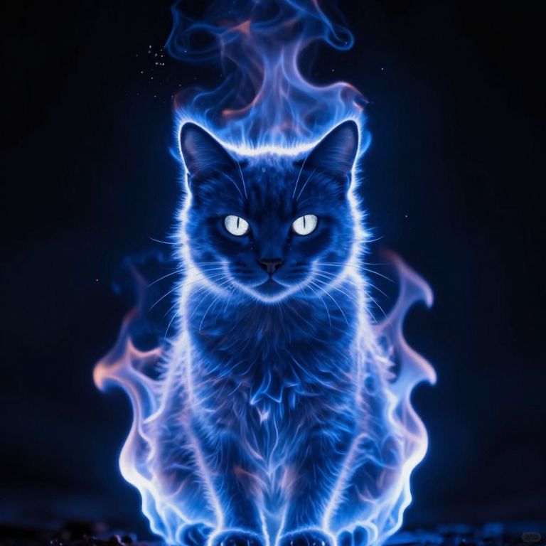 RAW photo, photo-realistic, 8k wallpaper, Amazing, blue fire, silhouette, explosion, The flame is in the silhouette of a cat, realistic fire, cat, aura, animal focus, no humans, looking at viewer, animal, watermark, Water is evaporating, smile, silver eyes, slit pupils, burning, glowing, kooo123, kooocat, koooflame