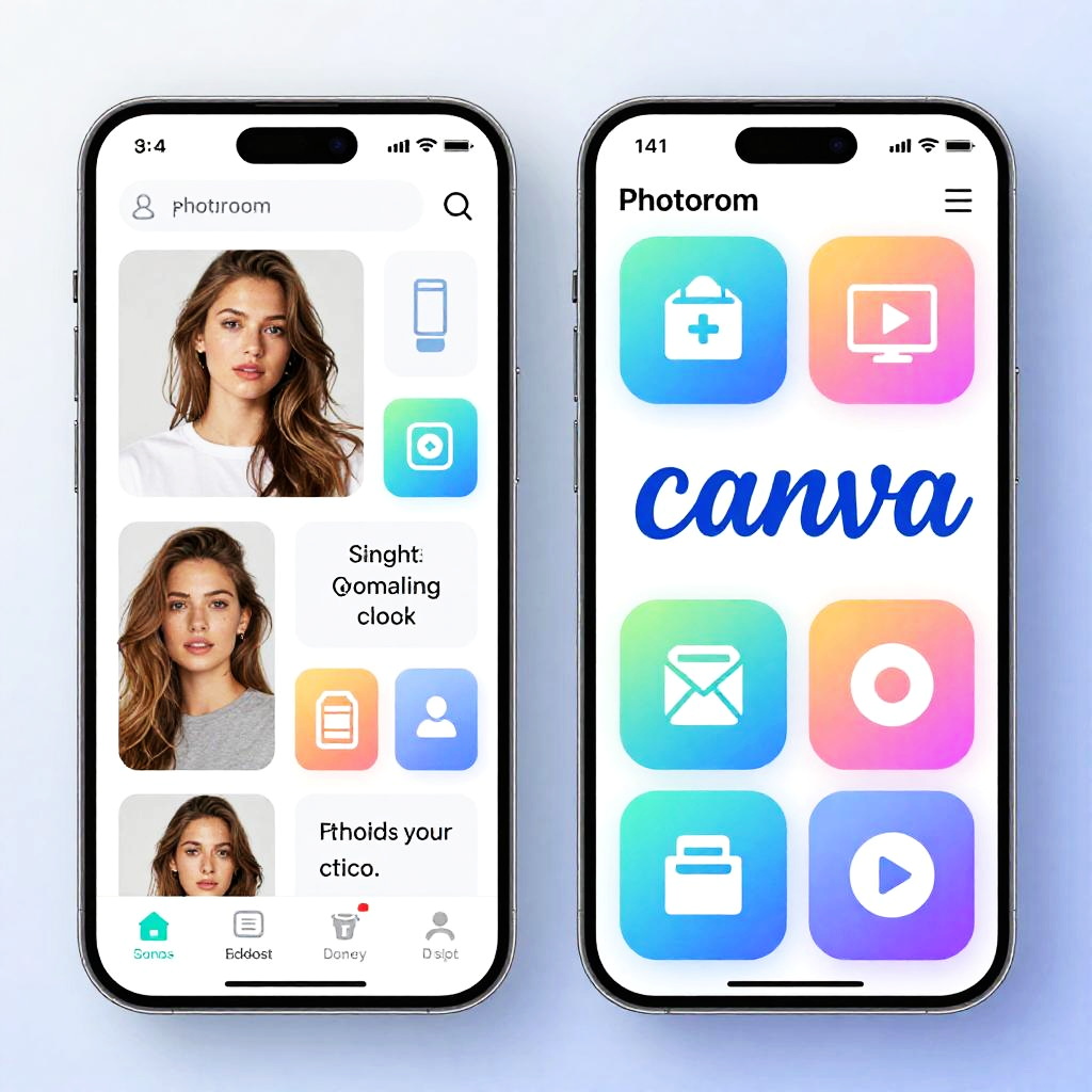 Photoroom vs canva comparison in a tech-themed illustration, photoroom showcasing background removal on a product photo, canva with colorful social media design templates, sleek futuristic interface, vibrant neon accents, dynamic composition