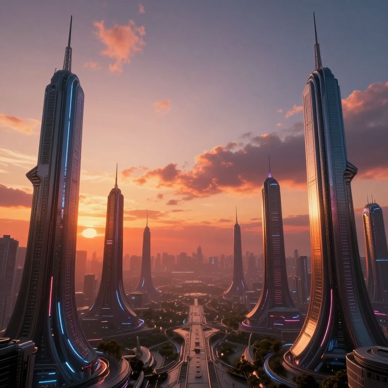 Photograph of futuristic cityscape at sunset, featuring tall, sleek skyscrapers with pointed spires, glowing neon lights, and vibrant orange-purple sky