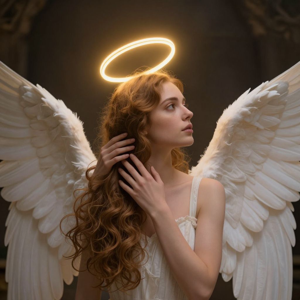 Photograph of a young Caucasian woman with long, wavy, auburn hair, wearing a white, short-sleeved dress. She has large, white, feathery angel wings extending from her back and a glowing golden halo above her head. She gazes to the side with a serene expression, her right hand gently touching her hair. The background is a simple, solid gray, emphasizing the ethereal, heavenly theme. The lighting is soft, highlighting the texture of her wings and the gentle waves of her hair. The overall composition evokes a sense of purity and divine grace.